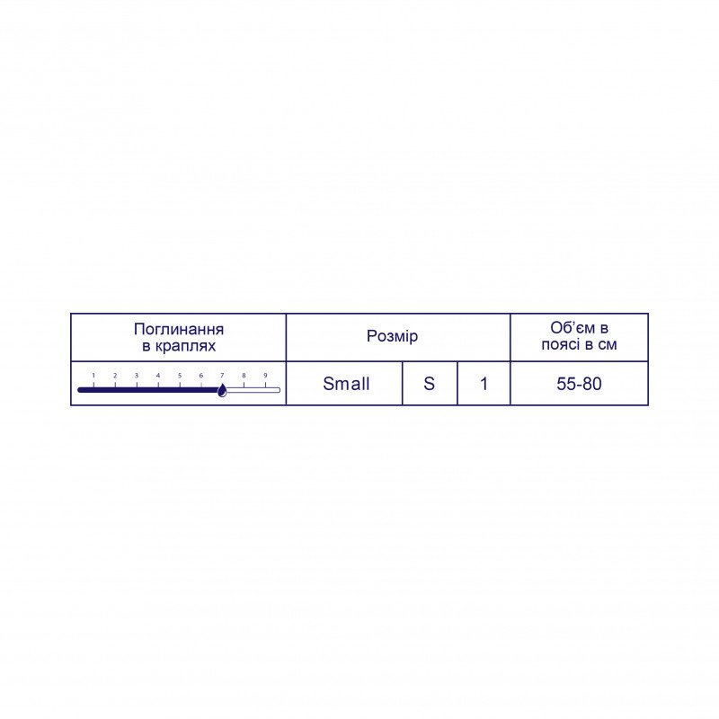 Еластична поясна резинка спереду і ззаду та дві пари еластичних застібок-липучок (ширина 32 мм) забезпечують оптимальне прилягання до тіла. Інформацію про наповнення та необхідність заміни підгузка дають 2 індикатори вологи: клейовий у вигляді смуг і напис з інформацією про виріб.
