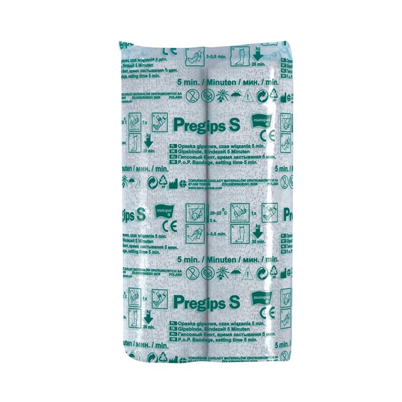Быстросхватывающий гипсовый бинт Pregips S незаменим там, где необходимо немедленное придание неподвижности. Специально подобранное сочетание гипсового материала, нанесенного на марлевый носитель самого выского качества, обеспечивает наложение прочной повязки с высокой конечной твердостью. Увеличенное количество гипсовой массы обеспечивает быстрое наложение повязки и меньшее количество используемых гипсовых бинтов. Универсален в использовании – оптимальное время схватывания способствует особой популярности использования этого изделия в травмпунктах. Характеристики: время намачивания - около 5 секунд, время схватывания - 5 минут, время моделирования - около 3 – 3,5 минут. Прочность и быстрое время схватывания позволяет производить первую нагрузку уже пoсле 20 минут. Основное средство иммобилизации при большинстве переломов и для коррекции деформаций. Ввиду короткого времени схватывания, используется для придания неподвижности в операционном блоке, где необходимо немедленное наложение гипсовой повязки, придания неподвижности у детей (дети очень подвижны, поэтому необходимо немедленное наложение гипсовой повязки).