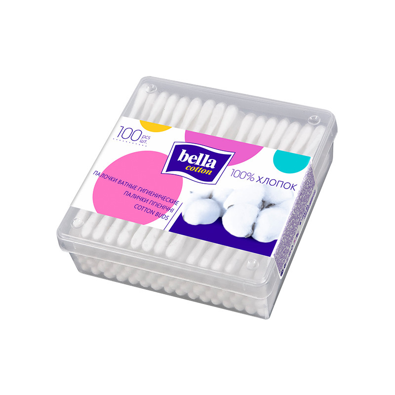 Ватные палочки BELLA Cotton. Пластиковая прямоугольная упаковка 100 шт.