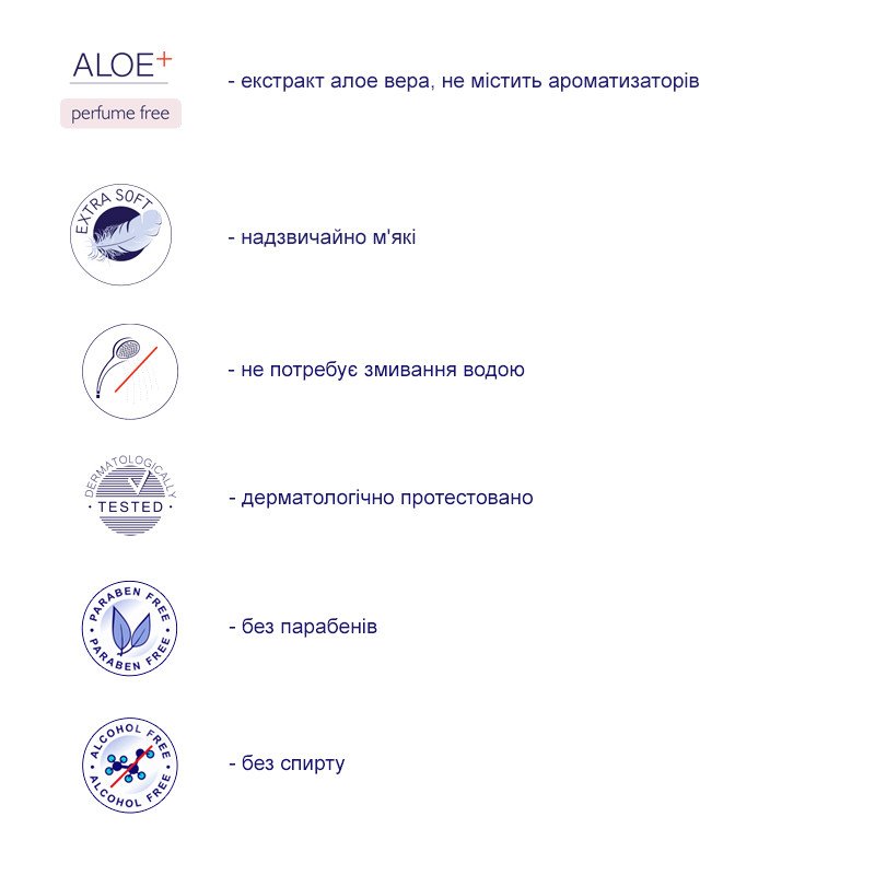 Серветки мають сприятливий до шкіри рівень pH 5,5, а також містять алантоїн та екстракт алое вера, який заспокоює подразнену шкіру. Не містить парабенів, ароматизованих композицій та спирту.