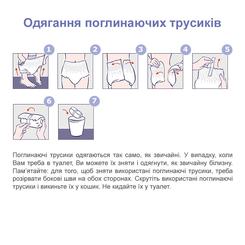 Завдяки антибактеріальному суперабсорбенту трусики добре поглинають та утримують вологу всередині, а також нейтралізують неприємні запахи. Спеціальний розподіляючий шар EDS забезпечує швидке і рівномірне поглинання, а м'який нетканий матеріал на поверхні - комфорт у використанні.